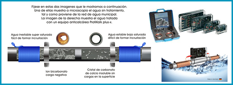 Sistemas compuestos por circuitos integrados, que generan mediante pulsos de alta frecuencia, señales variables de potencial eléctrico, adaptados a las diferentes dimensiones de tuberías y caudales a tratar.